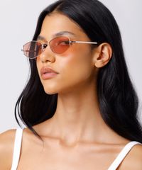 Óculos de sol desenvolvido em metal resistente na cor dourada, com formato oval e as extremidades arredondadas. A lente na cor rosa, a ponte em U e plaquetas embutidas. Com proteção da lente UVA e UVB.