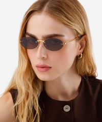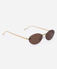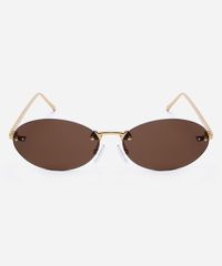 Óculos de sol feminino desenvolvido em metal resistente na cor dourada com formato oval e as extremidades arredondadas. Lente na cor marrom, ponte em U e plaquetas embutidas. Com proteção da lente UVA e UVB.