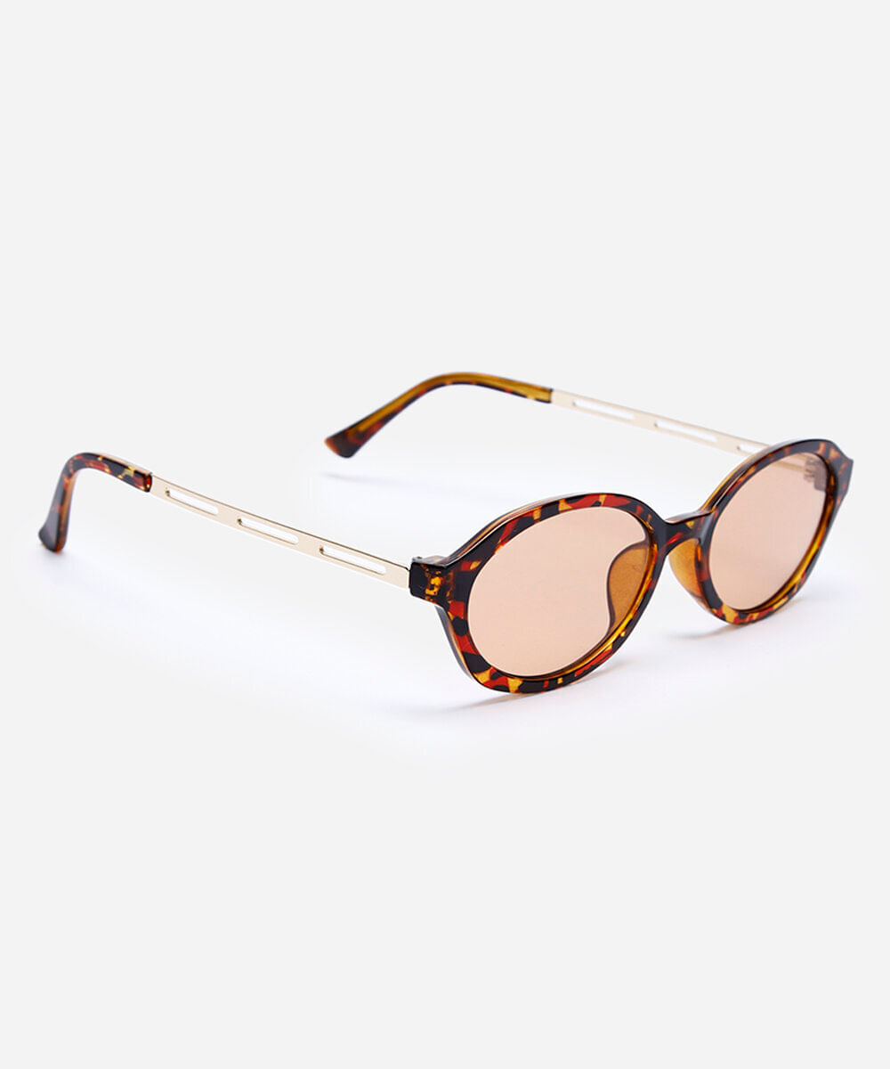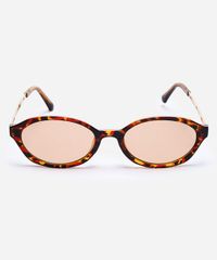 Óculos de sol desenvolvido em acetato resistente na cor marrom com efeito tartaruga, formato oval e as extremidades arredondadas. A lente na cor rosa, a ponte em U e plaquetas embutidas. Com proteção da lente UVA e UVB.