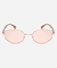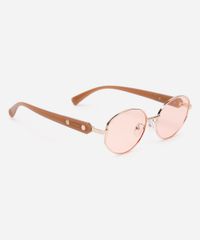 Óculos de sol desenvolvido em metal resistente na cor dourada, com formato oval e as extremidades arredondadas. A lente na cor rosa, a ponte em U e plaquetas embutidas. Com proteção da lente UVA e UVB.