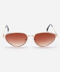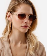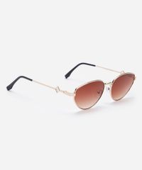 Óculos de sol desenvolvido em metal resistente na cor dourado com, formato oval e as extremidades arredondadas. A lente na cor marrom, a ponte em U e plaquetas embutidas. Com proteção da lente UVA e UVB.