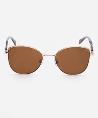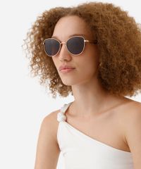 Óculos de sol desenvolvido em metal resistente na cor dourada, formato oval e as extremidades arredondadas. A lente na cor marrom, a ponte em U e plaquetas embutidas. Com proteção da lente UVA e UVB.
