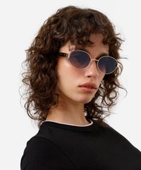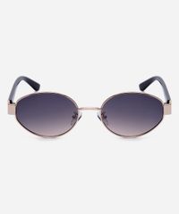 Óculos de sol desenvolvido em metal resistente na cor dourada, formato oval e as extremidades arredondadas. A lente na cor cinza, a ponte em U e plaquetas embutidas. Com proteção da lente UVA e UVB.