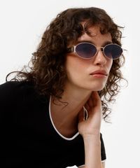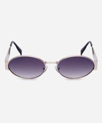 Óculos de sol desenvolvido em metal resistente na cor dourada, com formato oval e as extremidades arredondadas. A lente na cor cinza degradê, a ponte em U e plaquetas embutidas. Com proteção da lente UVA e UVB.