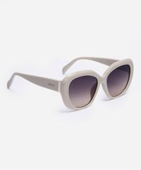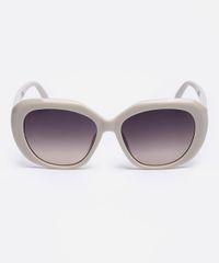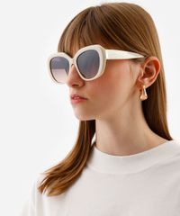 Óculos de sol feminino desenvolvido em acetato resistente na cor off white e formato oval com as extremidades arredondadas. Lente na cor cinza em degradê, ponte em U e plaquetas embutidas. Com proteção da lente UVA e UVB.