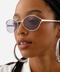 Óculos de sol desenvolvido em metal resistente na cor prata, com formato oval e as extremidades arredondadas. A lente na cor cinza, a ponte em U e plaquetas embutidas. Com proteção da lente UVA e UVB.