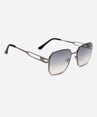 Óculos de sol desenvolvido em metal resistente na cor prateada, com formato oval e as extremidades arredondadas. A lente na cor cinza esverdeada, a ponte em U e plaquetas embutidas. Com proteção da lente UVA e UVB.