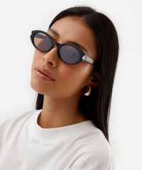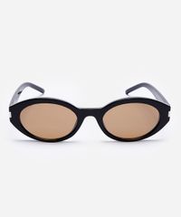Óculos de sol desenvolvido em acetato resistente na cor preta, com formato oval e as extremidades arredondadas. A lente na cor marrom, a ponte em U e plaquetas embutidas. Com proteção da lente UVA e UVB.