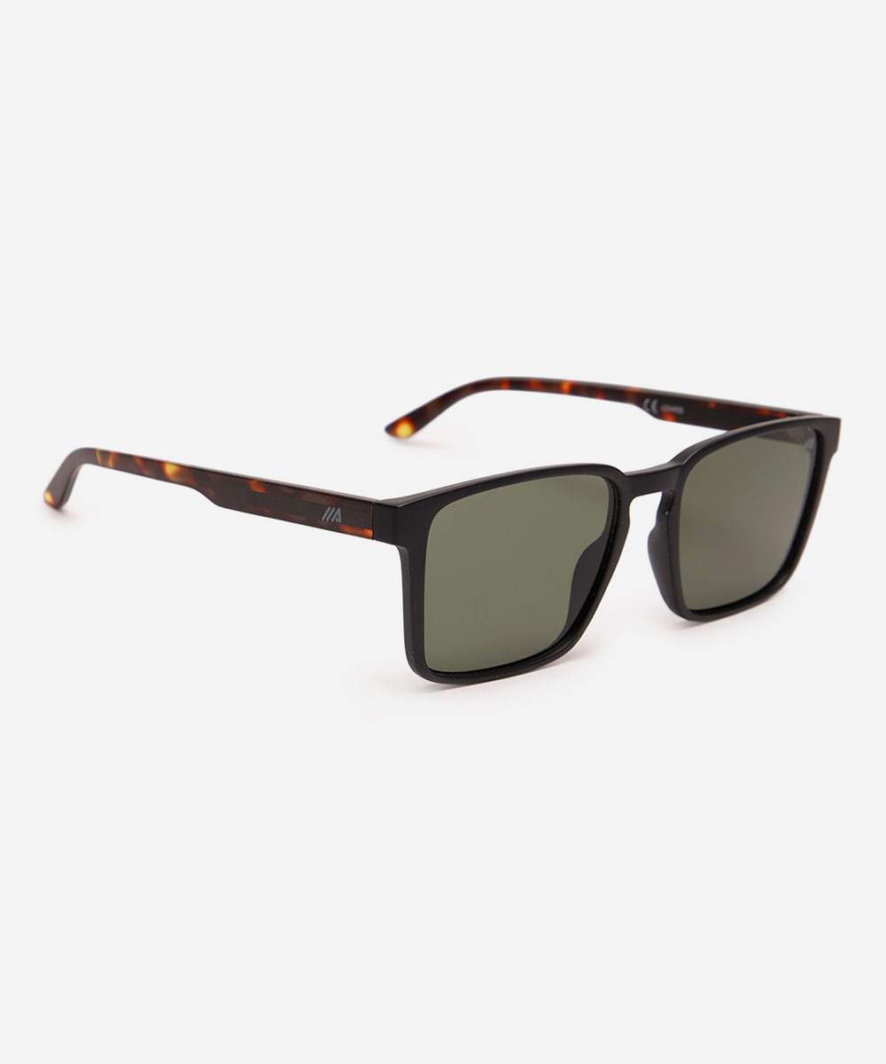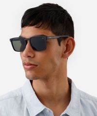 Óculos de sol desenvolvido em acetato resistente na cor preta com hastes com efeito tartaruga, com formato quadrado e as extremidades arredondadas. A lente na cor cinza esverdeado, a ponte em U e plaquetas embutidas. Com proteção da lente UVA e UVB.