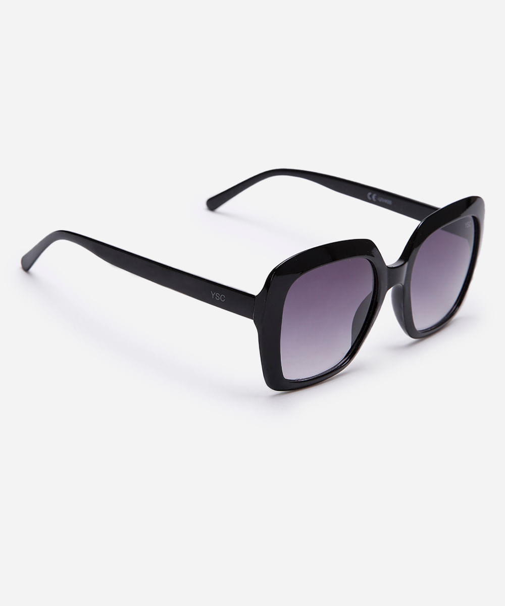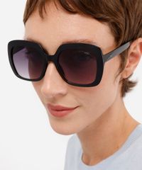 Óculos de sol desenvolvido em acetato resistente na cor preta, com formato quadrado e as extremidades arredondadas. A lente na cor cinza degradê, a ponte em U e plaquetas embutidas. Com proteção da lente UVA e UVB.