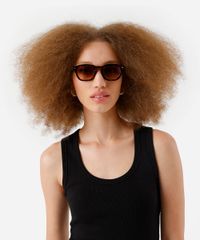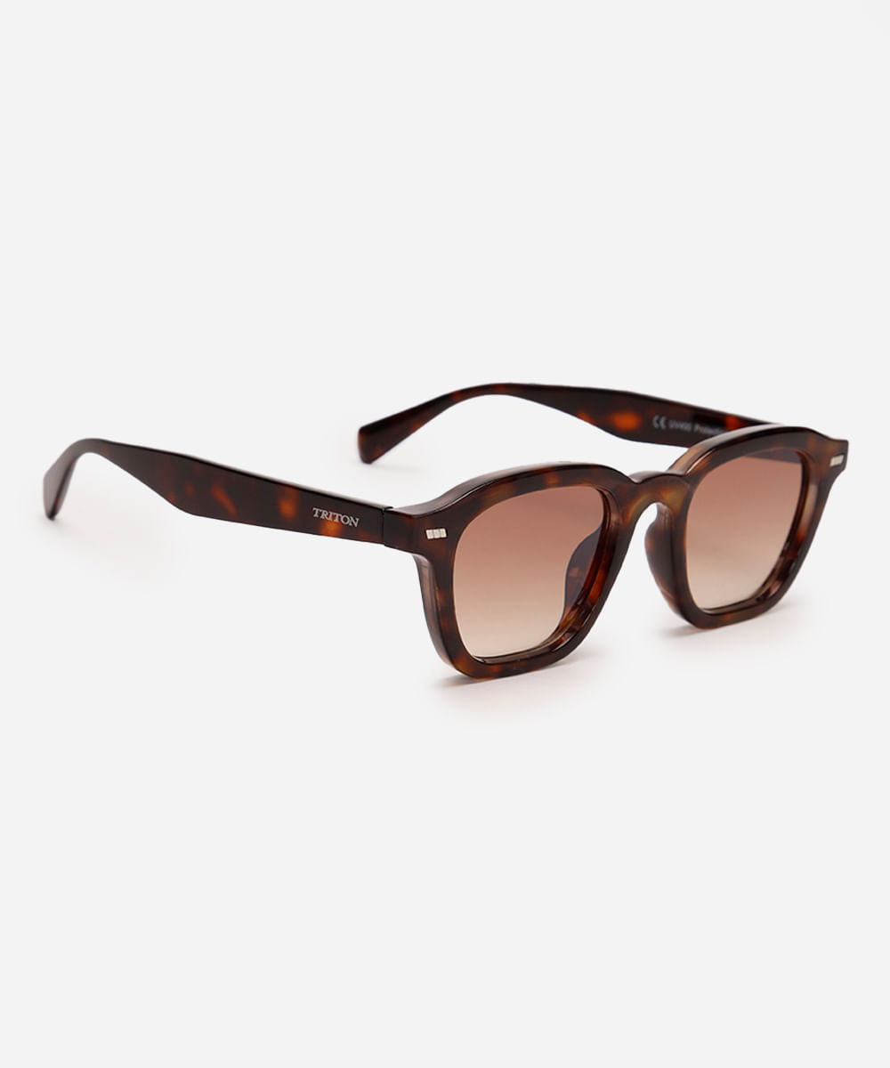 Óculos de sol desenvolvido em acetato resistente na cor marrom com efeito tartaruga, com formato quadrado e as extremidades arredondadas. A lente na cor marrom, a ponte em U e plaquetas embutidas. Com proteção da lente UVA e UVB.