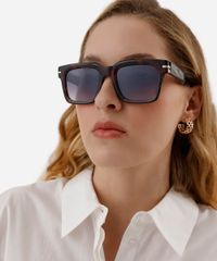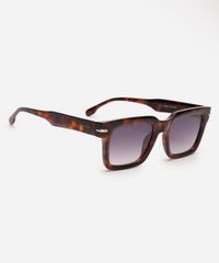 Óculos de sol desenvolvido em acetato resistente na cor marrom com efeito tartaruga, com formato quadrado e as extremidades arredondadas. A lente na cor cinza degradê, a ponte em U e plaquetas embutidas. Com proteção da lente UVA e UVB.