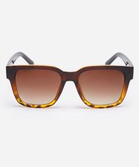 Óculos de sol desenvolvido em acetato resistente na cor marrom com efeito tartaruga, formato quadrado e as extremidades arredondadas. A lente na cor marrom deagradê, a ponte em U e plaquetas embutidas. Com proteção da lente UVA e UVB.