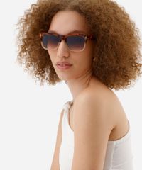 Óculos de sol desenvolvido em acetato resistente na cor marrom com efeito tartaruga e degradê, formato quadrado e as extremidades arredondadas. A lente na cor marrom degradê, a ponte em U e plaquetas embutidas. Com proteção da lente UVA e UVB.