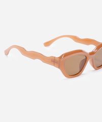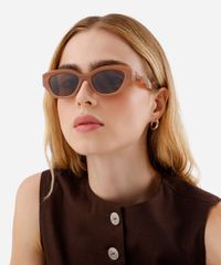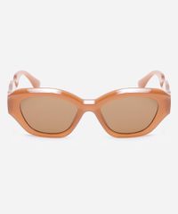 Óculos de sol desenvolvido em acetato resistente na cor bege com formato quadrado e as extremidades arredondadas. Lente na cor marrom, ponte em U e plaquetas embutidas. Com proteção da lente UVA e UVB.