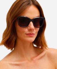 Óculos de sol feminino desenvolvido em acetato resistente na cor cinza com efeito fumê e hastes contrastantes, formato quadrado com as extremidades arredondadas. A lente na cor cinza com efeito degradê, a ponte em U e plaquetas embutidas. Com proteção da lente UVA e UVB.