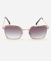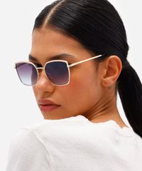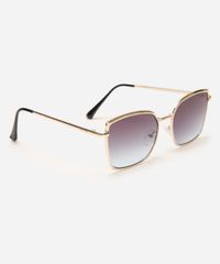 Óculos de sol desenvolvido em metal resistente na cor dourado, com formato quadrado e as extremidades arredondadas. A lente na cor azul, a ponte em U e plaquetas embutidas. Com proteção da lente UVA e UVB.