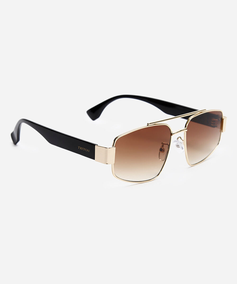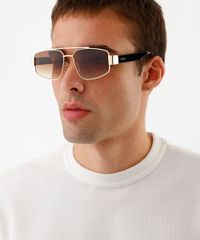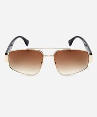 Óculos de sol desenvolvido em metal resistente na cor dourada, com formato quadrado e as extremidades arredondadas. A lente na cor marrom degradê, a ponte em U e plaquetas embutidas. Com proteção da lente UVA e UVB.