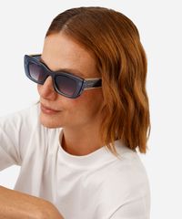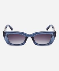 Óculos de sol desenvolvido em acetato resistente na cor azul com formato quadrado e as extremidades arredondadas. Lente na cor cinza, ponte em U e plaquetas embutidas. Com proteção da lente UVA e UVB.