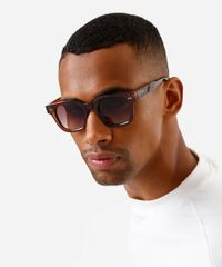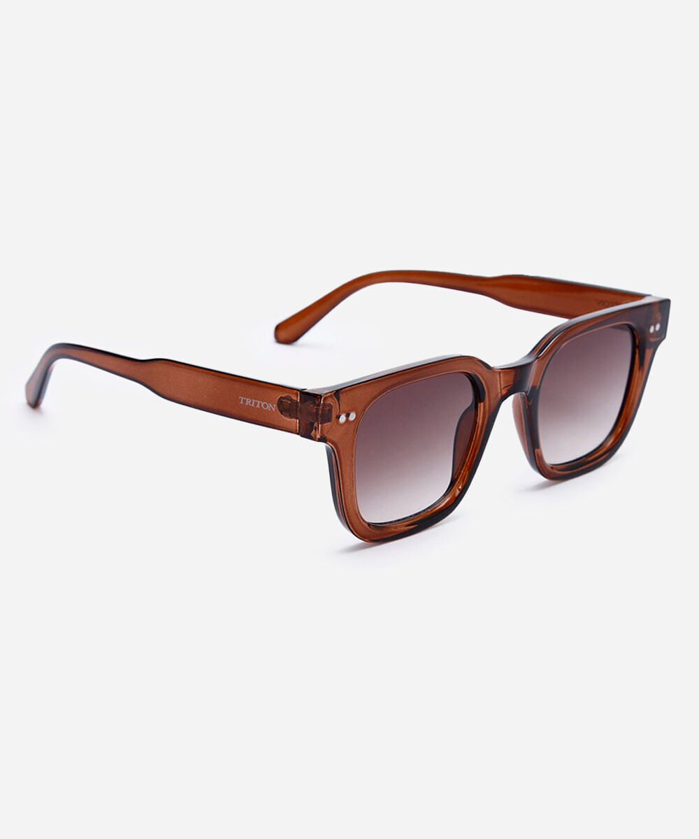Óculos de sol desenvolvido em acetato resistente na cor marrom com formato quadrado e as extremidades arredondadas. Lente na cor cinza degradê, ponte em U e plaquetas embutidas. Com proteção da lente UVA e UVB. A Triton é uma marca de óculos brasileira com mais de 40 anos, especializada no mercado ótico, tem o propósito de levar modelos de acessórios: óculos de sol, óculos de grau e óculos clipon personalizados para o público masculino, feminino e infantil.