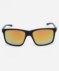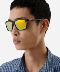 Óculos de sol desenvolvido em acetato resistente na cor preta com formato quadrado e as extremidades arredondadas. Lente na cor amarela com efeito espelhado, ponte em U e plaquetas embutidas. Com proteção da lente UVA e UVB.