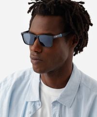 Óculos de sol desenvolvido em acetato resistente na cor preta com detalhe azul, com formato quadrado e as extremidades arredondadas. A lente na cor cinza, a ponte em U e plaquetas embutidas. Com proteção da lente UVA e UVB.