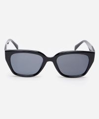 Óculos de sol desenvolvido em acetato resistente na cor preta, formato quadrado e as extremidades arredondadas. A lente na cor cinza, a ponte em U e plaquetas embutidas. Com proteção da lente UVA e UVB.