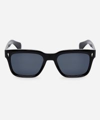 Óculos de sol desenvolvido em acetato resistente na cor preta, com formato quadrado e as extremidades arredondadas. A lente na cor cinza, a ponte em U e plaquetas embutidas. Com proteção da lente UVA e UVB.