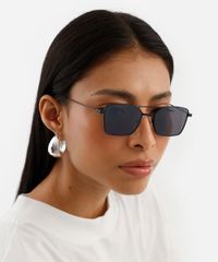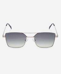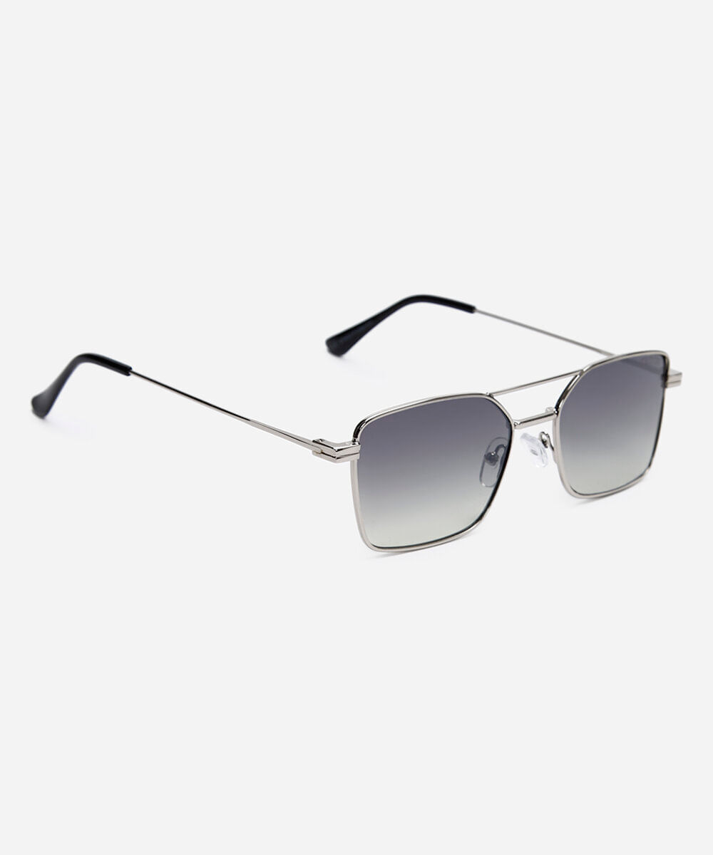 Óculos de sol desenvolvido em metal resistente na cor prateada, com formato quadrado e as extremidades arredondadas. A lente na cor cinza esverdeada, a ponte em U e plaquetas embutidas. Com proteção da lente UVA e UVB.