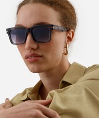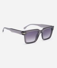 Óculos de sol desenvolvido em acetato resistente na cor preta com efeito fume, formato quadrado e as extremidades arredondadas. A lente na cor cinza, a ponte em U e plaquetas embutidas. Com proteção da lente UVA e UVB.