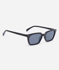 Óculos de sol desenvolvido em acetato resistente na cor preta, com formato quadrado e as extremidades arredondadas. A lente na cor cinza, a ponte em U e plaquetas embutidas. Com proteção da lente UVA e UVB.