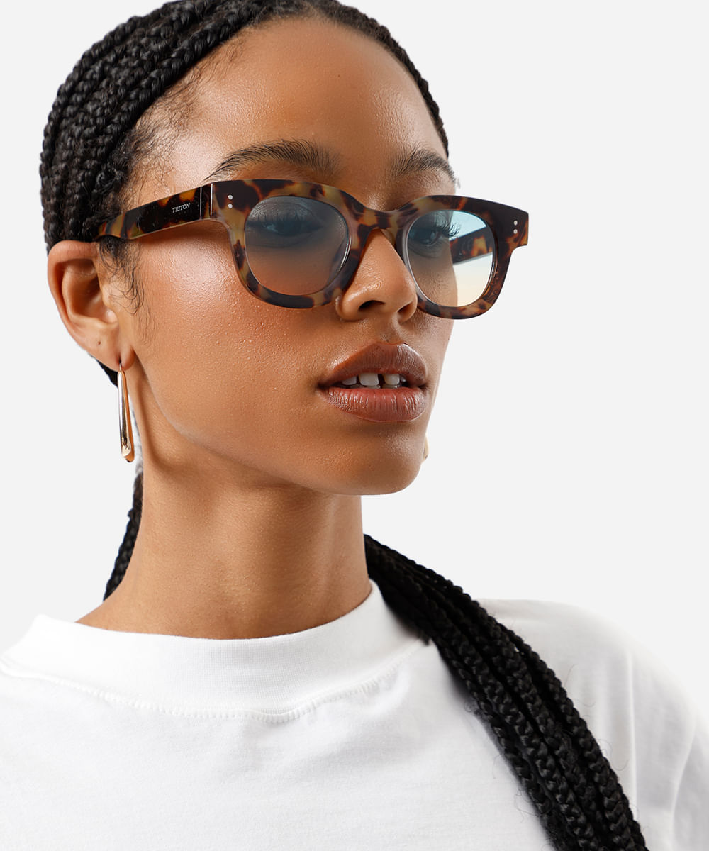 Óculos de sol desenvolvido em acetato resistente na cor marrom com efeito tartaruga, formato redondo e as extremidades arredondadas. A lente na cor azul e marrom, a ponte em U e plaquetas embutidas. Com proteção da lente UVA e UVB.