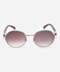 Óculos de sol feminino desenvolvido em metal resistente na cor dourada e hastes em acetato na cor marrom com efeito fumê, formato redondo com as extremidades arredondadas. A lente na cor marrom com efeito degradê, a ponte em U e plaquetas embutidas. Com proteção da lente UVA e UVB.