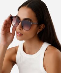 Óculos de sol desenvolvido em acetato resistente na cor marrom, com formato redondo e as extremidades arredondadas. A lente na cor marrom degradê, a ponte em U e plaquetas embutidas. Com proteção da lente UVA e UVB.