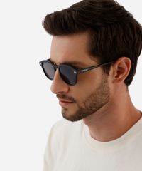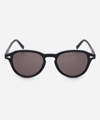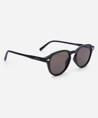 Óculos de sol desenvolvido em acetato resistente na cor preta, com formato redondo e as extremidades arredondadas. A lente na cor cinza, a ponte em U e plaquetas embutidas. Com proteção da lente UVA e UVB.