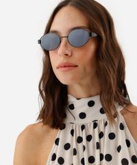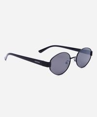 Óculos de sol desenvolvido em metal resistente na cor preta, formato redondo e as extremidades arredondadas. A lente na cor cinza, a ponte em U e plaquetas embutidas. Com proteção da lente UVA e UVB.