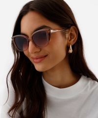Óculos de sol desenvolvido em acetato resistente na cor rosa, com formato redondo e as extremidades arredondadas. A lente na cor marrom, a ponte em U e plaquetas embutidas.