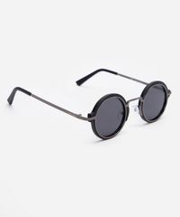 Óculos de sol desenvolvido em metal resistente na cor cinza, com formato redondo e as extremidades arredondadas. A lente na cor cinza, a ponte em U e plaquetas embutidas. Com proteção da lente UVA e UVB.