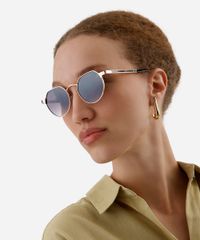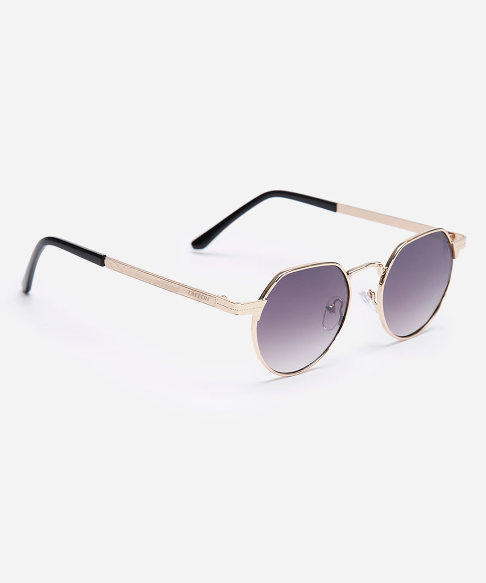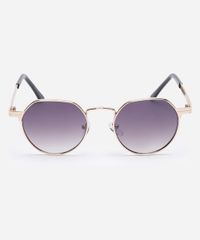 Óculos de sol desenvolvido em metal resistente na cor dourada, com formato redondo e as extremidades arredondadas. A lente na cor cinza degradê, a ponte em U e plaquetas embutidas. Com proteção da lente UVA e UVB.