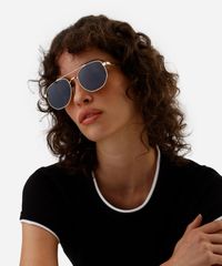 Óculos de sol desenvolvido em metal resistente na cor dourada, formato redondo e as extremidades arredondadas. A lente na cor marrom, a ponte em U e plaquetas embutidas. Com proteção da lente UVA e UVB.