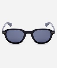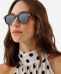 Óculos de sol desenvolvido em acetato resistente na cor preta, com formato redondo e as extremidades arredondadas. A lente na cor cinza, a ponte em U e plaquetas embutidas. Com proteção da lente UVA e UVB.