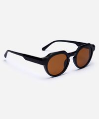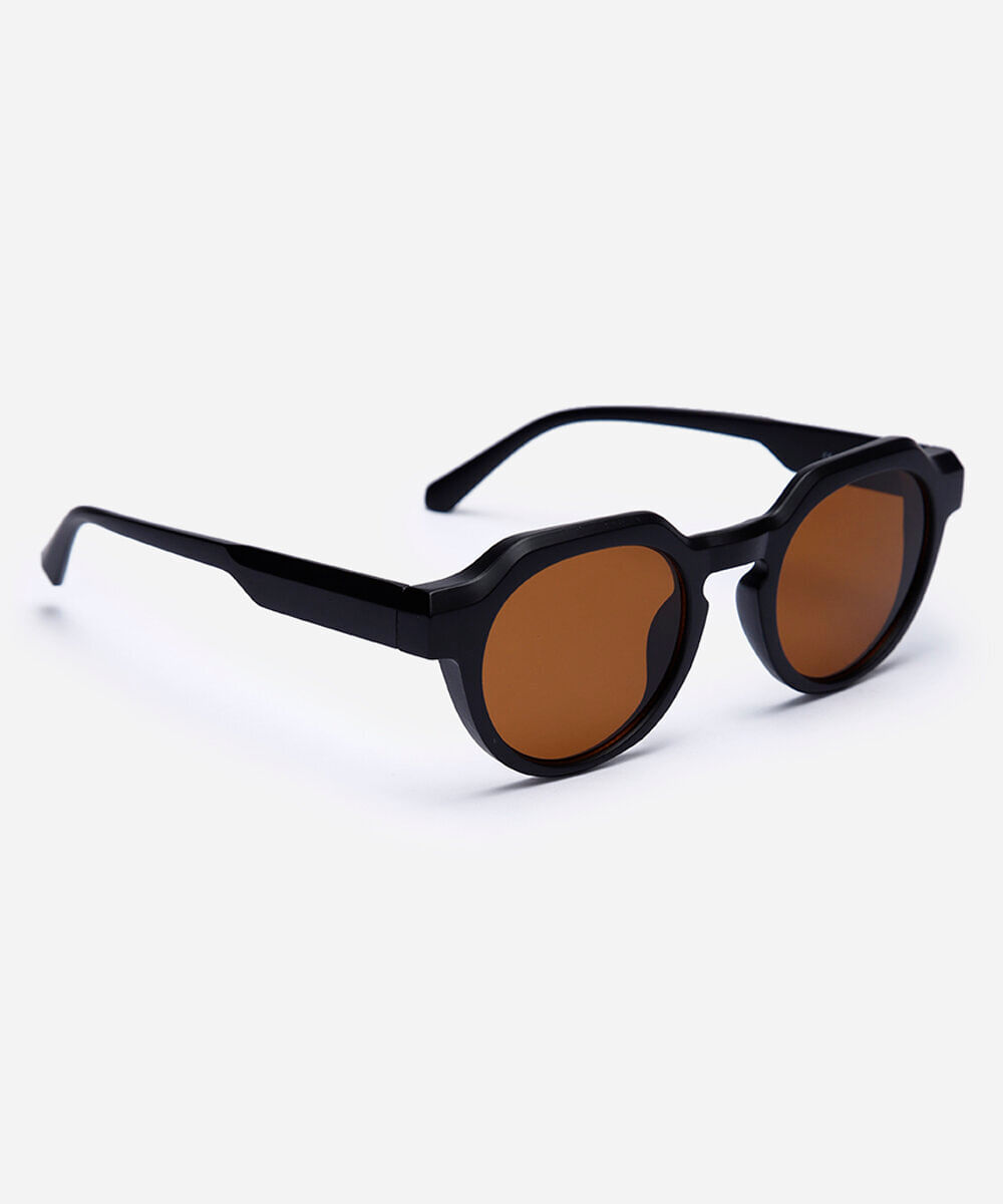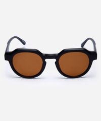 Óculos de sol desenvolvido em acetato resistente na cor preta, com formato redondo e as extremidades arredondadas. A lente na cor marrom, a ponte em U e plaquetas embutidas. Com proteção da lente UVA e UVB.