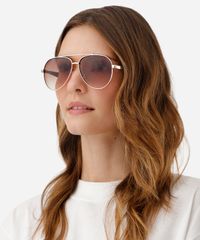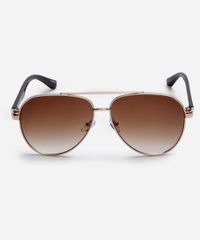 Óculos de sol unissex desenvolvido em metal resistente na cor dourada com formato aviador e as extremidades arredondadas. A lente na cor marrom degrade, a ponte em U e plaquetas embutidas. Com proteção da lente UVA e UVB.