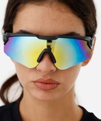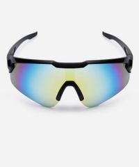 Óculos de sol unissex desenvolvido em acetato resistente na cor preta com formato esportivo e as extremidades arredondadas. A lente na cor mista espelhado, a ponte em U e plaquetas embutidas. Com proteção da lente UVA e UVB.