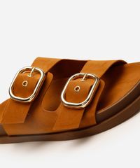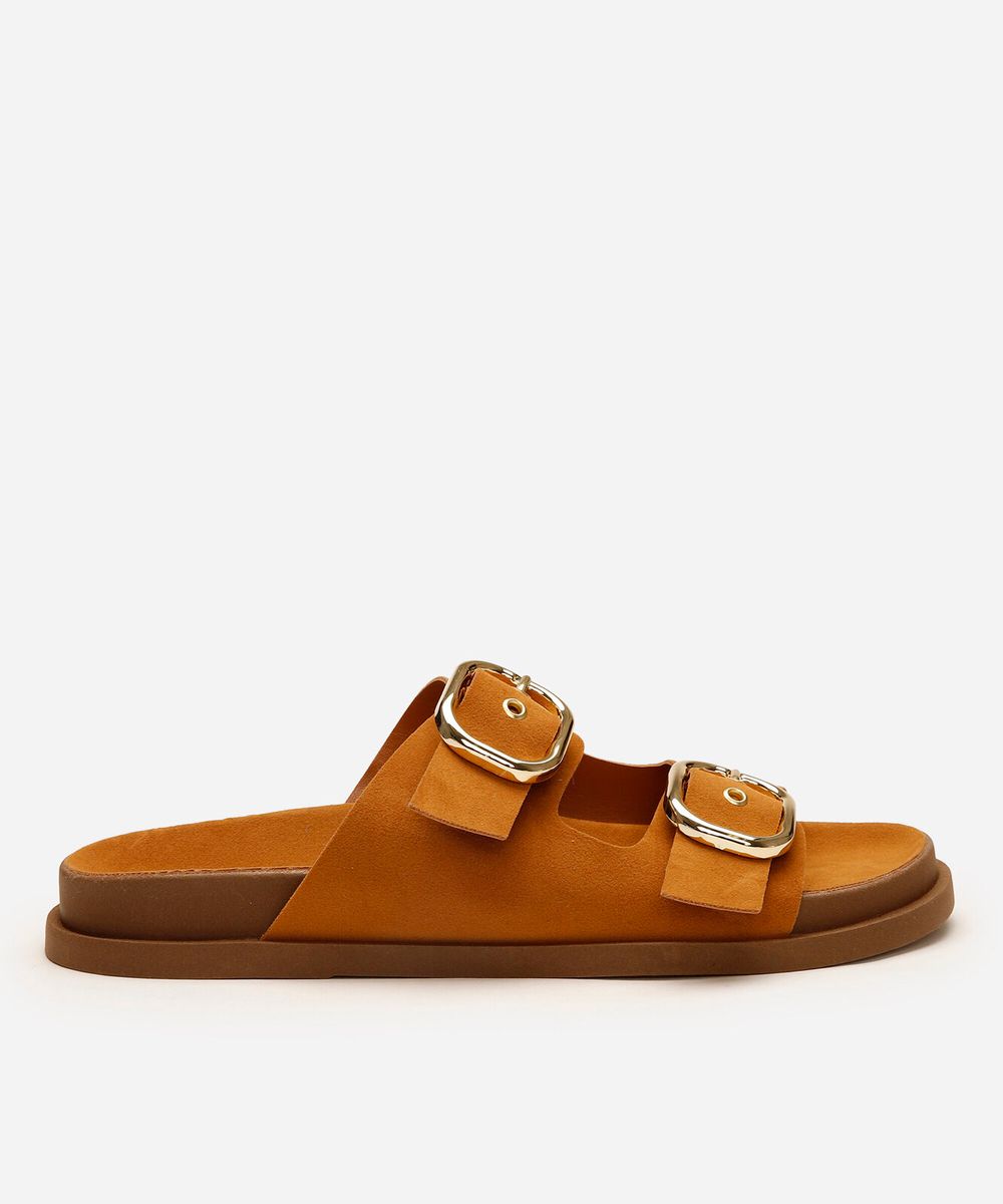 • Cabedal com duas tiras largas em material com textura de camurça, proporcionando um toque macio.