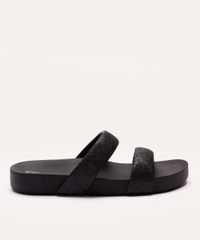 • Cabedal com duas tiras largas e paralelas com aplicação de glitter, que adicionam um ponto de luz ao visual.