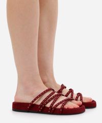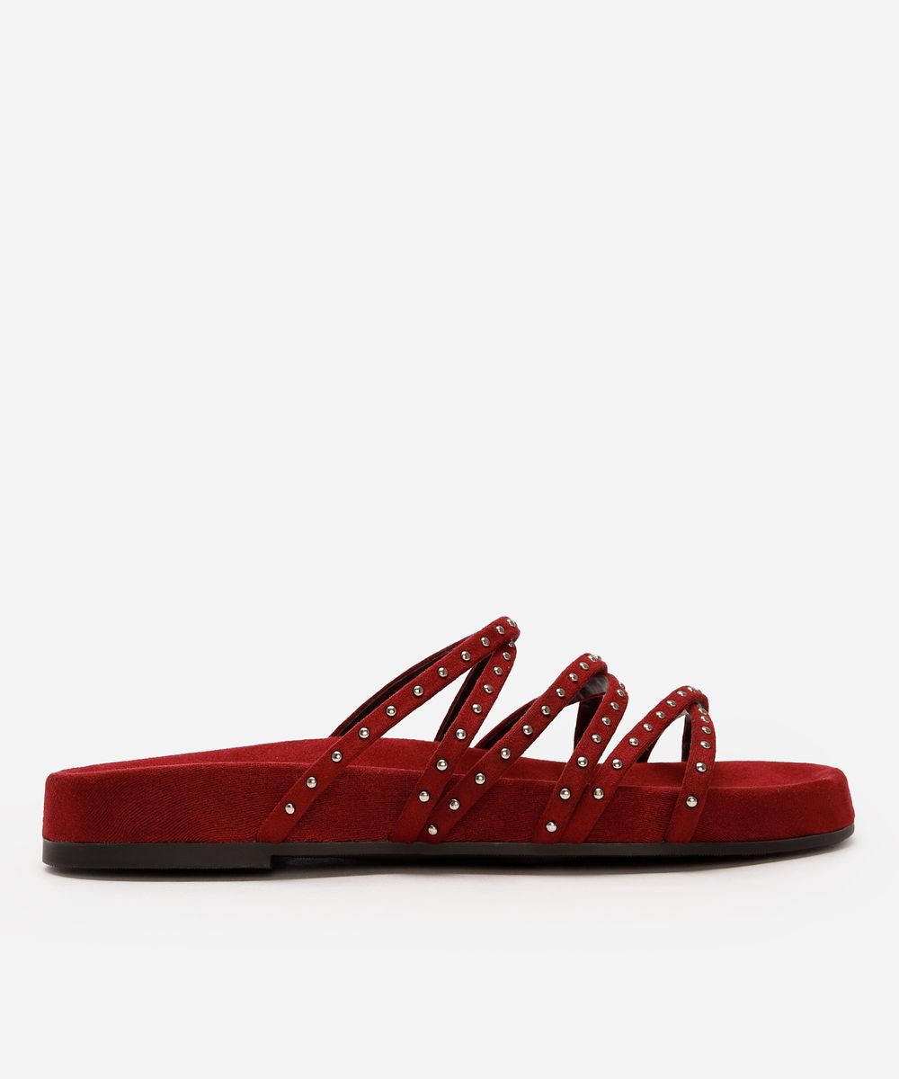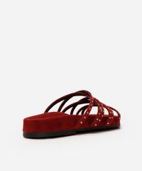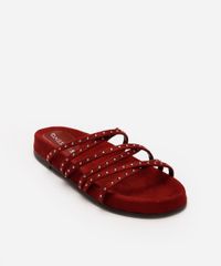 • Cabedal com múltiplas tiras finas e cruzadas, adornadas com tachas metálicas que adicionam um ponto de luz e estilo.