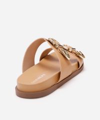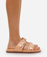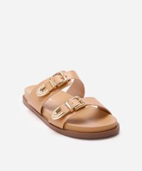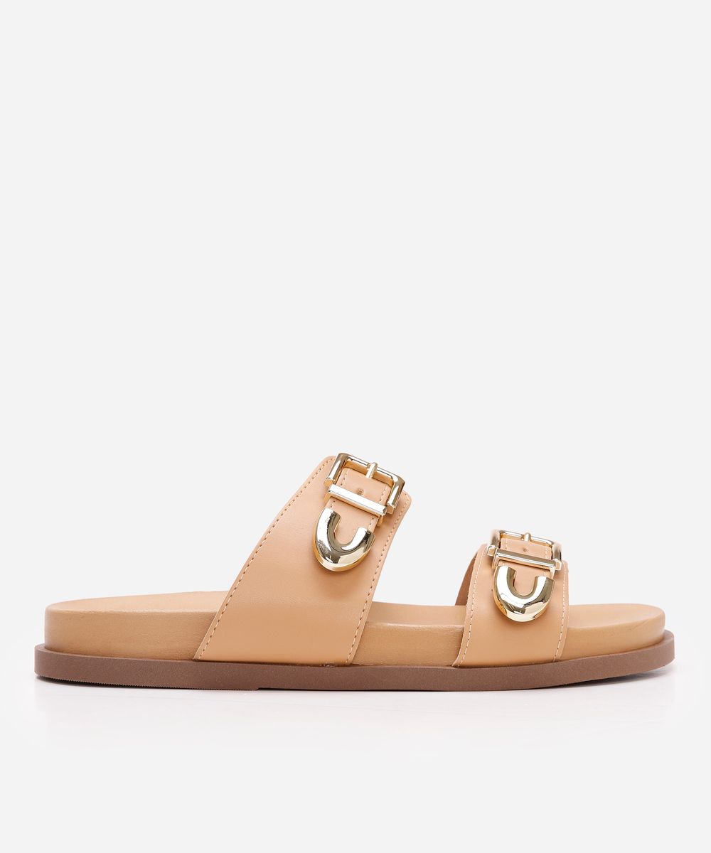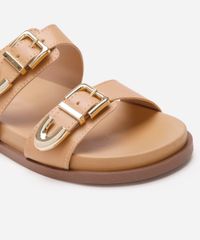 • Cabedal com duas tiras largas e fivelas metálicas douradas que permitem um ajuste perfeito aos pés.