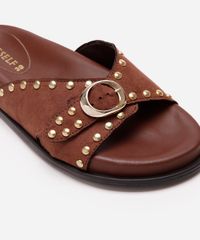 • Cabedal com tiras largas e cruzadas, adornado com tachas metálicas e uma fivela decorativa.