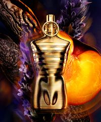 • Frasco icônico em formato de torso masculino, com um acabamento dourado e texturizado que reflete a opulência do perfume.